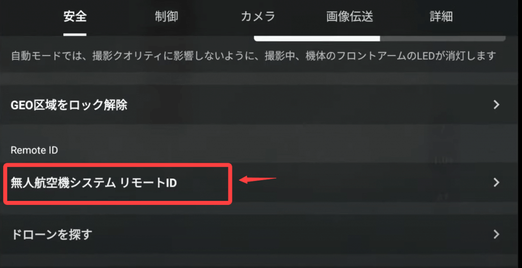 続けてカメラビュー画面から右上〈・・・〉→〈安全〉→〈無人航空機システム リモートID〉とタップします。DIPS 2.0にログインするよう求められますので、IDとパスワードを入力すると作業完了です。