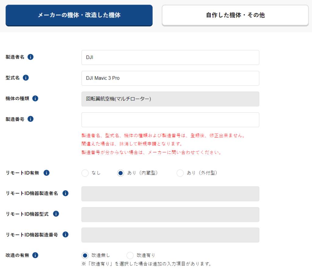 機体情報の入力に進みます。今回はDJI Mavic 3 Proを登録しますので「メーカーの機体・改造した機体」を選びます。プルダウンから製造者名「DJI」、型式名「DJI Mavic 3 Pro」を選択してください。ここまではプルダウンから選ぶので、入力する必要はありません。機体の種類は自動的に「回転翼航空機(マルチローター)」が選ばれるはずです。Mavic 3シリーズの場合、リモートIDは製造時に組み込まれていますので「あり(内蔵型)」を選んでください。内蔵型リモートIDの場合、グレーアウトしているリモートIDの製造者名や製造番号は入力できません。そのまま次の画面に進んで大丈夫です。