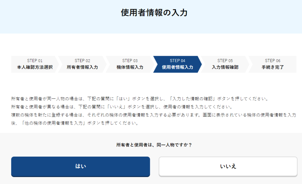 機体シリアルナンバーまで入力し、残る入力は「使用者情報」のみとなりました。所有者・使用者が同一の場合は「所有者と使用者は、同一人物ですか?」を「はい」とクリックするだけで自動入力されます。別の方が使う場合は氏名とふりがな、住所、生年月日、電話番号、メールアドレスを入力してください。