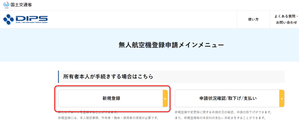 では、本題に入りましょう。こちらはPCでDIPS 2.0にログインした状態の画面です、「無人航空機の登録申請へ」をクリックします。