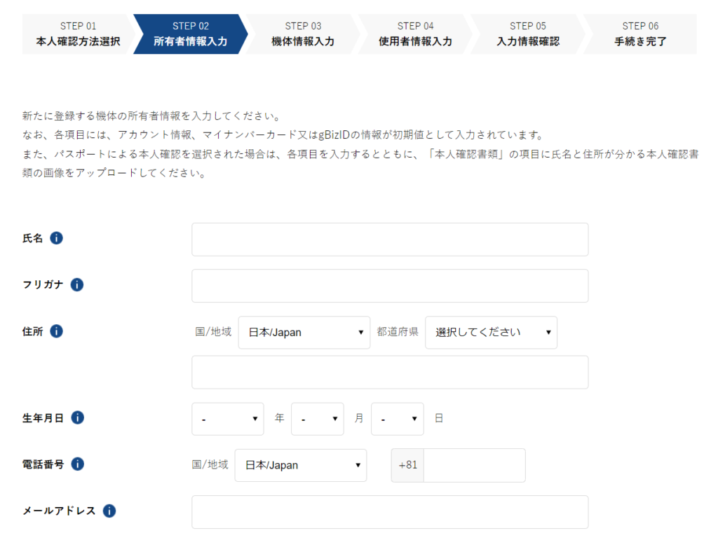 所有者情報を入力します。所有者情報は氏名とふりがな、住所、生年月日、電話番号、メールアドレスが必要です。