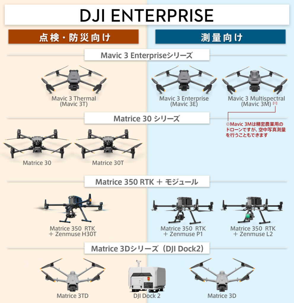 今回のテーマとなる「産業用ドローン」はこの区分となります。幅広い業務での利活用ができるのですが、特に、測量/インフラ点検/防災・災害対応などで使われ、その業務に特化した嬉しい機能を多く備えています。「DJI PILOT 2」というアプリで操縦を行うものとなります。2023年現在、現行のDJI産業用ドローン(およびモジュール)のラインナップが以下の画像の通りです。