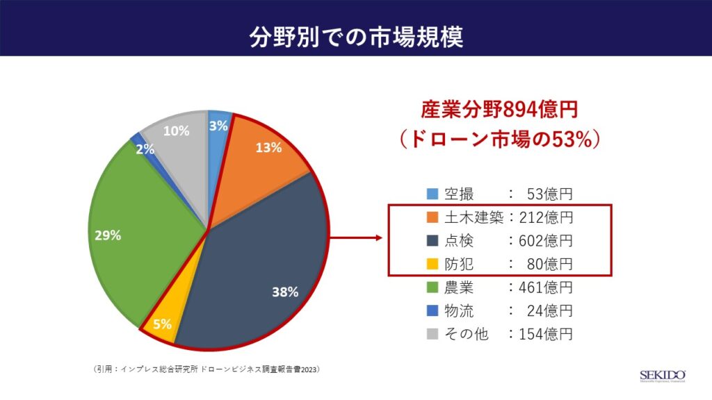 また、産業用ドローンはビジネスという観点でも非常に注目されている分野となっています。ドローン市場の約53%を占めており、機体からサービスまで含めると894億円の市場となっています。