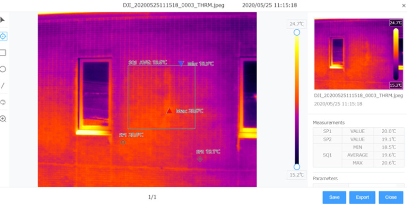 赤外線カメラでは、人間の目では確認ができない温度情報を可視化することができます。建物点検であればタイルの浮きや漏水の状況確認など、ソーラーパネル点検であればホットスポットの検出、災害現場であれば夜間などでの捜索を行うことができます。