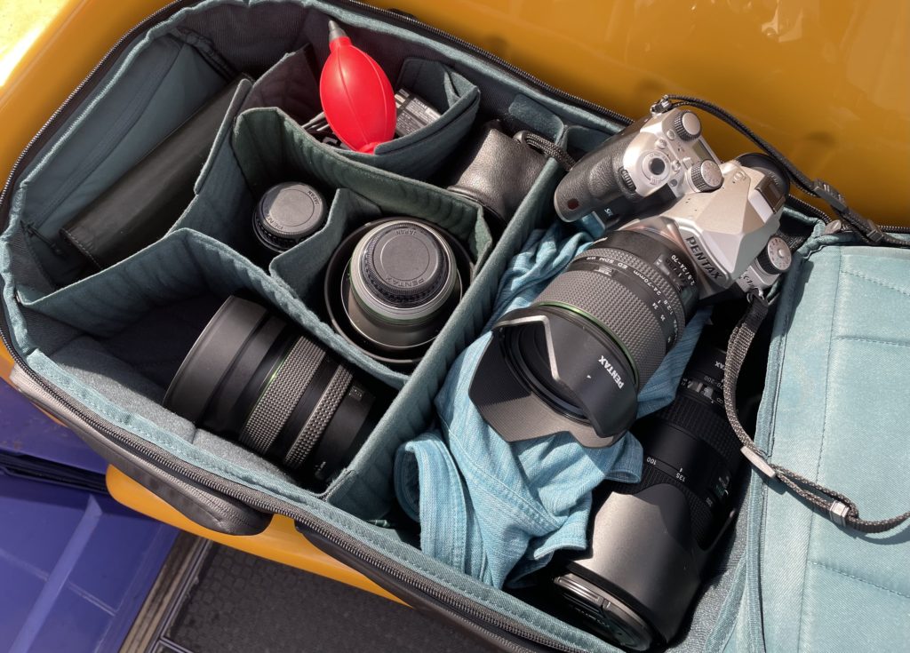 一覧の機材のほかPENTAXでも試しており、K-1 Mark IIとDFA 24-70mm F2.8とDFA 85mm F1.4で丁度よい収まり具合で、フルサイズ機でも問題なしです。このような手ごろなサイズのカメラバッグは、機材には妥協せず、自分は軽快に動きたいという望みを叶えてくれますので、一つは持っておきたくなります。紹介しているうちに気がついたら先に買ってしまいそうで困りますね。