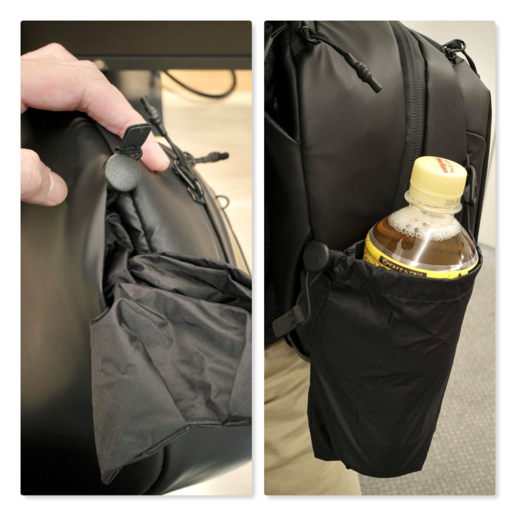 6Lと10Lには、正面から見て左下、外側の隙間からペットボトルケースがにゅっと登場します。取り出した後、側面の穴に引っ掛けて2点吊りするので、強度も問題なさそうです。もちろん、耐水性の生地を使用しているので濡れても安心です。撮影の際も、そうでなくともお出かけの時には水分補給は必ずするもの。しかし、せっかくのカメラバッグ、隅から隅まで機材を入れたいという私にとって、必要な時だけ用意できるドリンクホルダーは非常にありがたいのです。