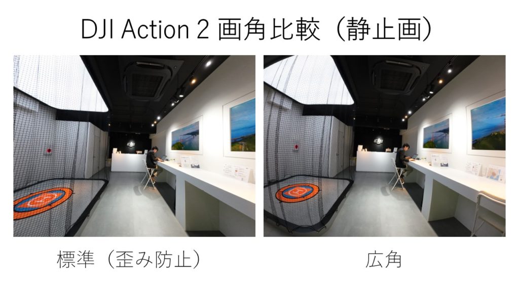 まずは写真編です。Action 2(128GB)のFOVは155°ですが、静止画では「標準(歪み補正)」「広角」の2つから画角を選択することが可能です。アスペクト比は4:3と16:9から選べます。静止画の画素数は12MPで、データ容量はJPEGの場合1枚あたり約8MBです。ちなみにRAWも撮影できますが、JPEGとRAWの同時記録はできません。
