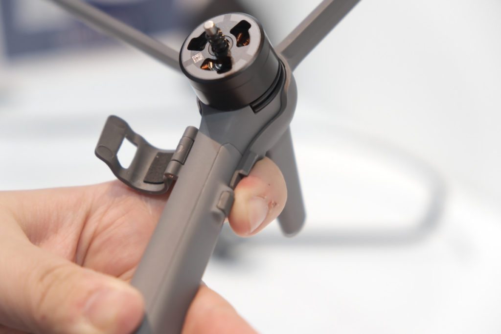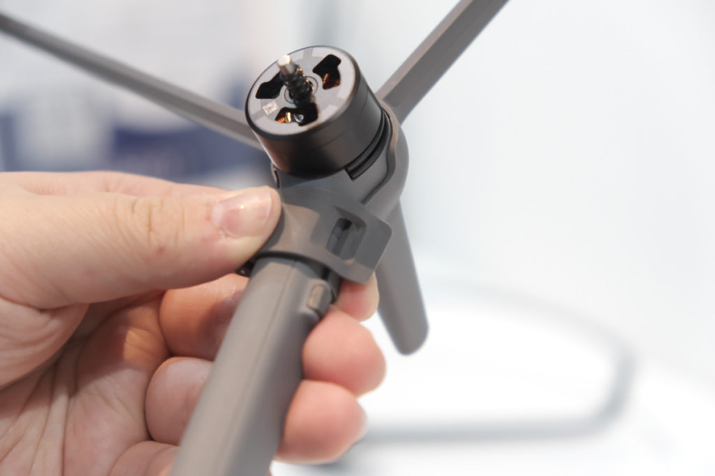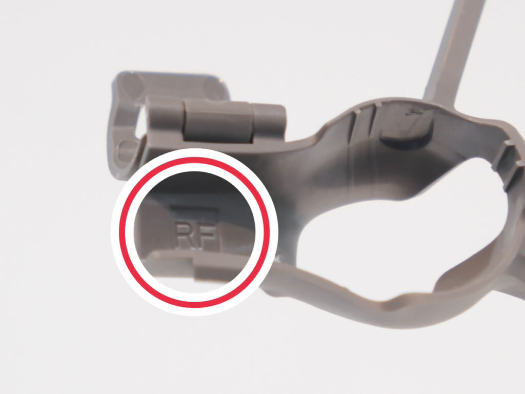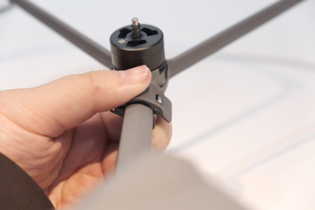 これは Air 3 用プロペラガードのクリップ部分を横から大きく写したところです。クリップはあごのような構造をしています。下あごで上あごを覆うように被せ閉じることでクリップをロックすることができます。機体への装着時には下あごを引き、上あごで覆うように力を加えるのがポイントです。うまく力を加えることができれば、女性の片手でも着脱することができました。現場で戸惑うことがないように、実際のフライト前に練習しておきましょう。