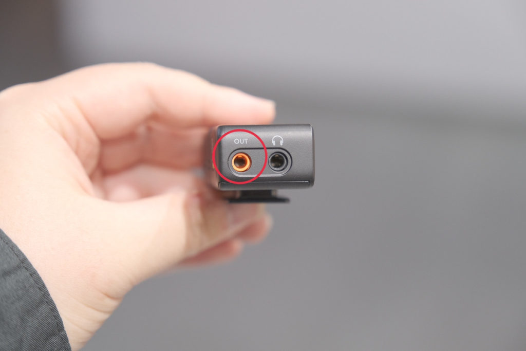 次は Mic 2 レシーバーの確認です。こちらには[OUT]と印字のあるオレンジ色の端子があります。先ほどのデジカメの端子とこのオレンジの端子を、付属の Mic 2 カメラ音声ケーブル(3.5mm TRS)で接続することでカメラ側の準備は完了です。