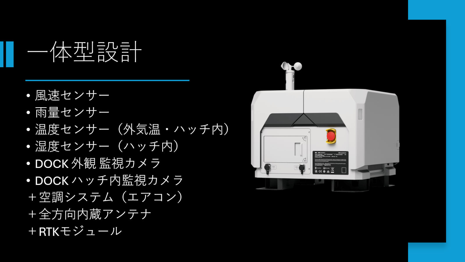 DJI Dock 2 は自動離発着や機体の適切な管理を実現するため、多様なセンサーを内蔵した一体型設計となっています。