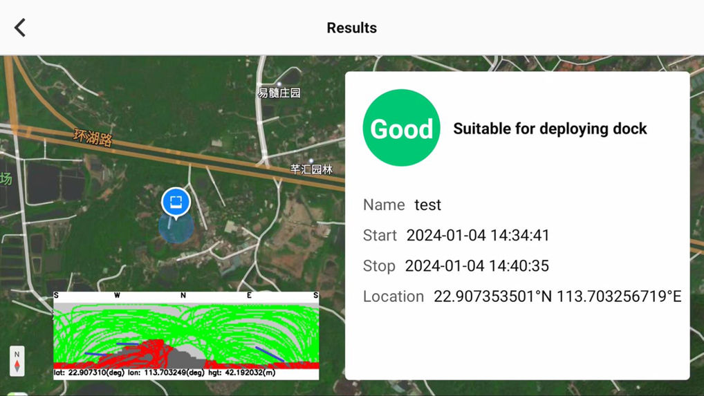 DJI Dock 2 では機体と合わせて設置場所が適しているかの評価を行います。具体的には、機体のビジョンセンサーを使用して周囲環境を確認し、そのエリアが強力なGNSS信号を受信可能かどうかを素早く判断します。ビジョンセンサーを使用したこの新しい評価機能により、設置場所選択の所要時間を従来の5時間から12分に短縮し、効率性が向上しました。