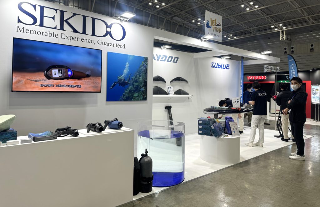ここからはセキドブースで展示した製品をご紹介します。ブース内で一番人気を集めたのは、軽量・コンパクトな水中スクーターの WAYDOO subnado (ウェイドゥサブナード)です。1.2時間の充電で(100W充電使用時)最長56分間、最大5km/h水中で自由に移動することができます。実際に水槽で性能を体験できるタッチ&トライのコーナーも設けました。