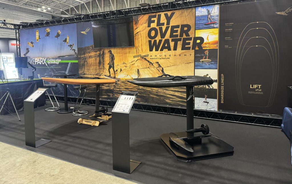 最後に他のブースを写真でご紹介します。ちょうど真後ろのブースも電動フォイルボードを取り扱っていました。