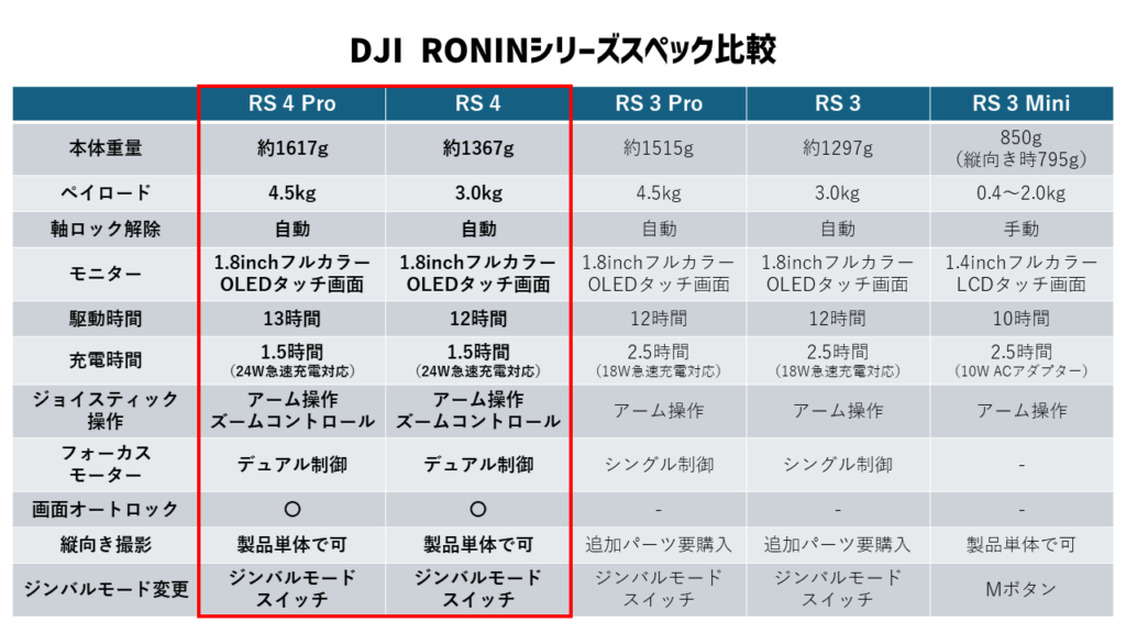 まずは、DJIの最新ジンバル・スタビライザー DJI RS 4 Pro/RS 4 のスペックから攻めてみましょう。