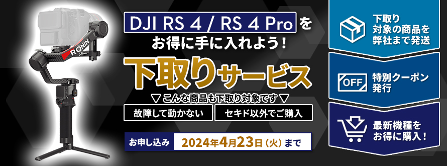 また最新機種の発売を記念し、 DJI RS 4 Pro/RS 4 への買い替えがお得なスタビライザー製品の下取りサービスを4月23日(火)までセキドオンラインで実施いたします。 DJI Ronin から、MOZA AirCross や Manfrotto Gimbal シリーズなどを対象に、故障して動かない製品、セキド以外で購入された製品も下取りいたします。この機会にぜひ、機材の買い替えをご検討ください。