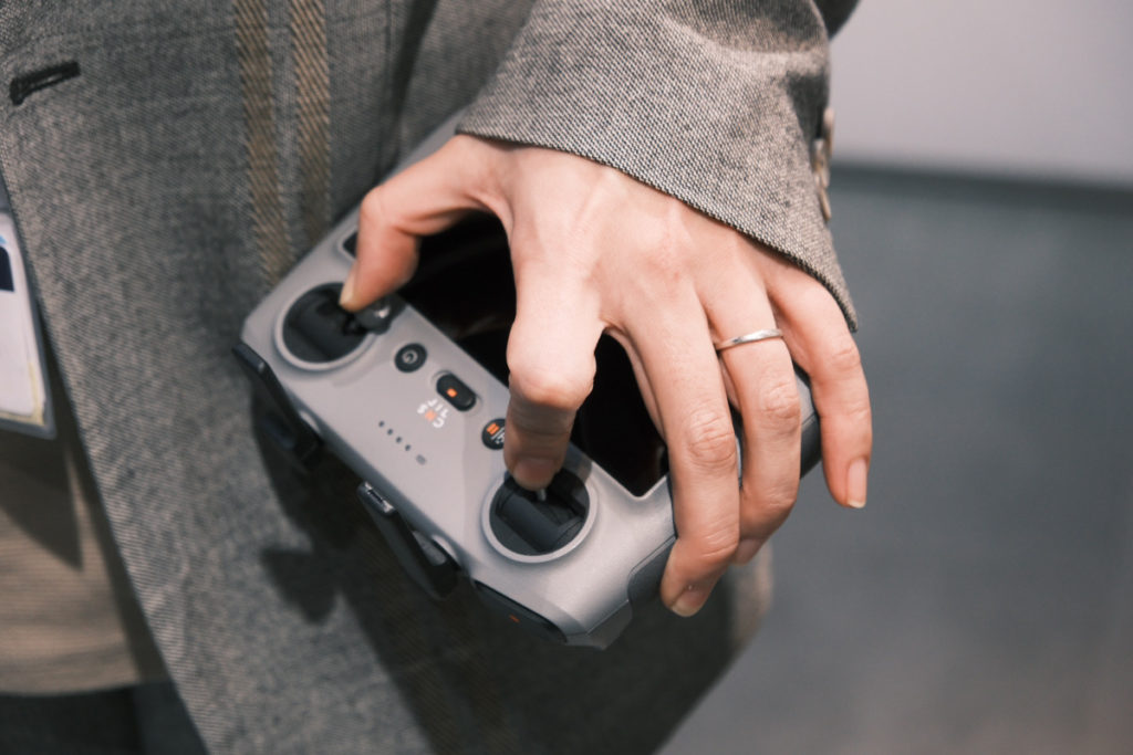それでは、実際の手順について細かく説明していきましょう。まずはドローンと送信機の電源を入れて、片手ずつに持ちます。