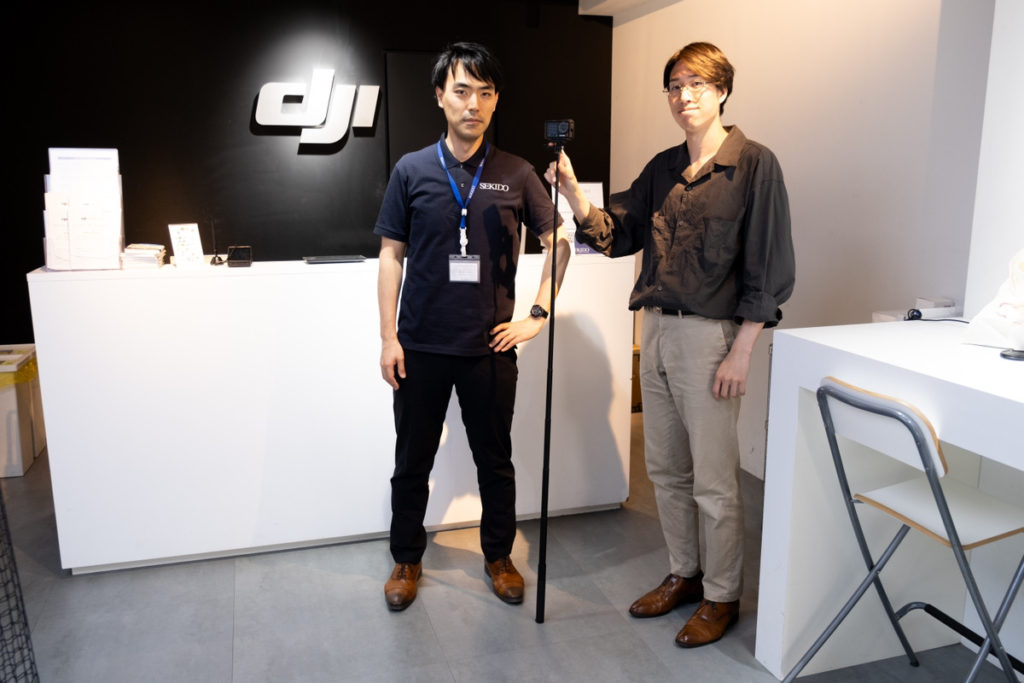 最長まで伸ばした延長ロッドを身長175cmの男性社員に持ってもらい、写真を撮ってみました。余談ですが、この写真を撮るとき「2人のうち、どちらかにモデルをして欲しい」と依頼したところ、2人とも「じゃあ俺が」「いえ私(わたくし)が」と一歩も譲らないので、2人一緒に写しました。2人とも製品愛の強い、私のかわいい後輩社員です。DJI認定ストア 東京虎ノ門で会えますので、見かけたときは話しかけてみてくださいね。
