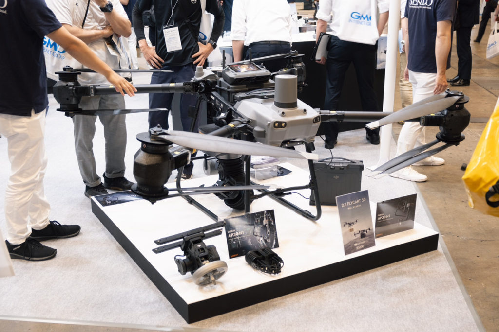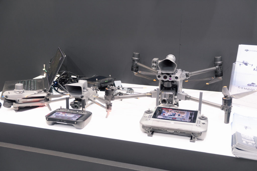 こちらは Mavic 3 Enterpriseシリーズ(左)と Matrice 30T(右)です。点検・測量業務のほか、消防関係では捜索や人命救助でも使用されています。展示機には、上空から地上に向けて呼びかけができる別売のスピーカーが取り付けられています。