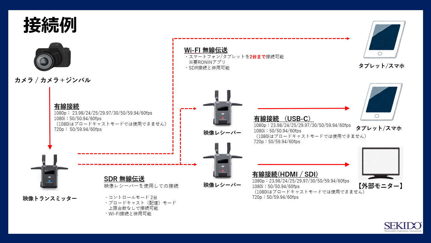 2点目は、無料の DJI Roninアプリを使うことで、SDR Transmission とスマホやタブレットをWi-Fi経由で直接無線接続が可能になったことです。もちろん DJI Transmission と同様にレシーバーからSDI・HDMIを通じてモニターに映像を送ることも可能ですが、今作はそれだけではありません。下記3パターンの接続方法が実現されました。