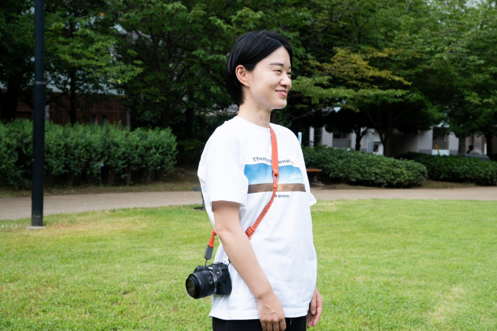 さっそく、スタッフが試着してみました。身長150cm台のマーケ担当 出澤にLサイズのストラップを最短の状態(1100mm)で付けてもらいました。斜め掛けにすると、カメラは骨盤のあたりにおさまる印象です。