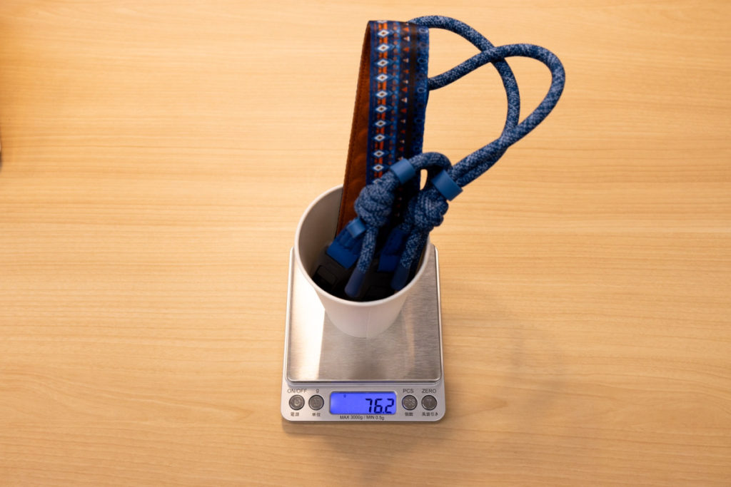 ストラップ重量は公称75.5gです。クイックコネクター2つを含む実測値は76.2gでした。軽いですね!