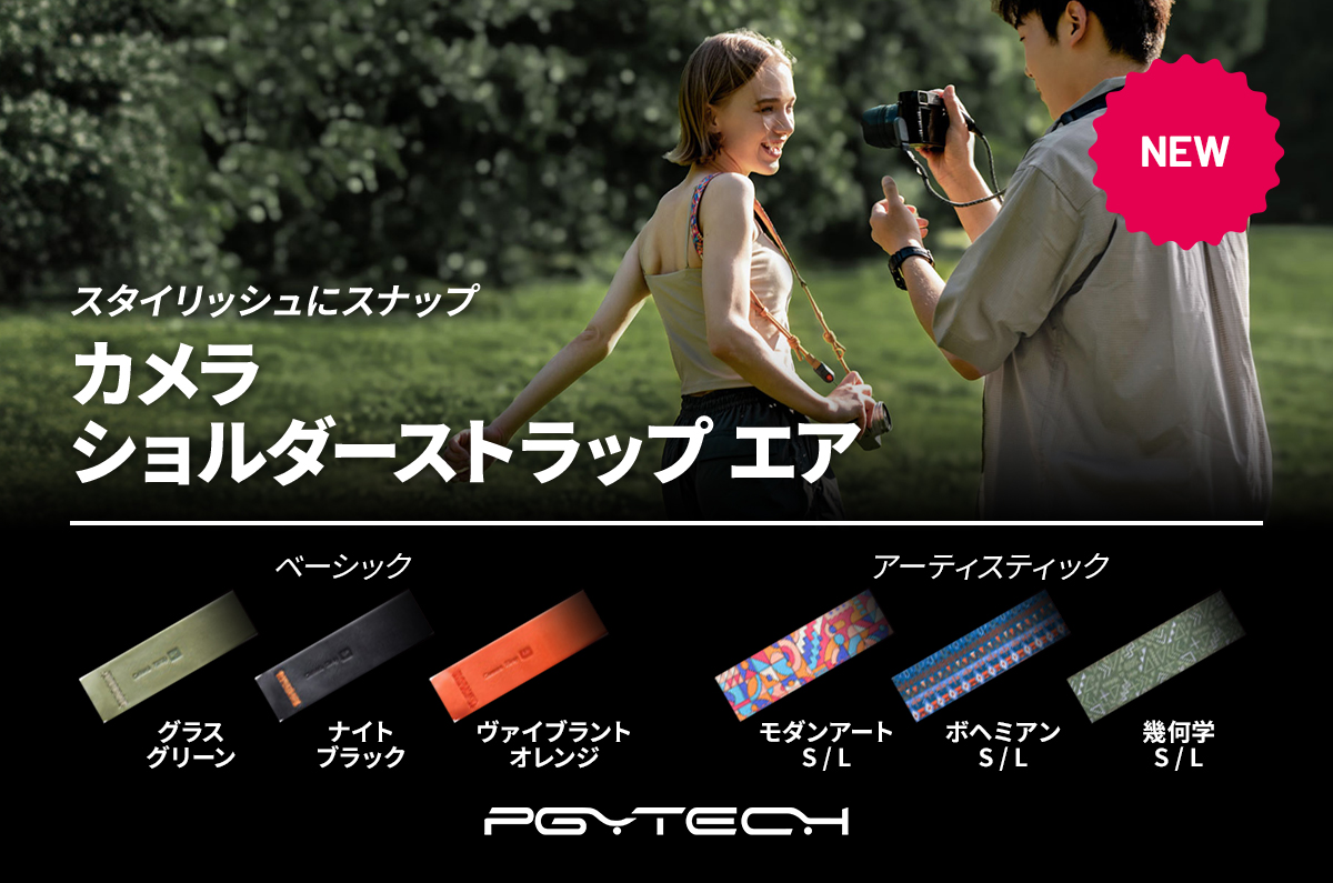 まずは製品概要から紹介いたします。カメラショルダーストラップ エアは、撮影を楽しむ世界のユーザーに愛用されるカメラアクセサリメーカーである PGYTECH から、2024年7月23日21時に発表・発売された新製品です。価格はすべて税込5,500円で、ベーシックスタイル 3色、アーティスティックスタイル 3色のカラーバリエーションがあります。