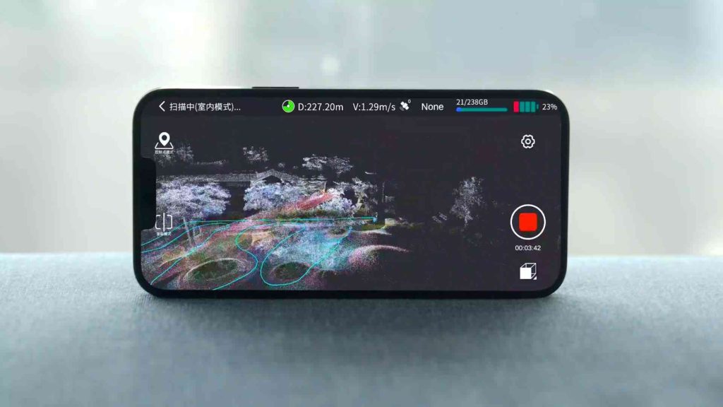 最大重量1.9kgで、1TBの大容量ストレージを内蔵しており製品単体でスキャンを行うことができます。有効範囲が広いほどSLAMが安定し、取得点数が多いほど点密度が上がります。さらに多彩なアクセサリーによってドローンに乗せることも可能です。