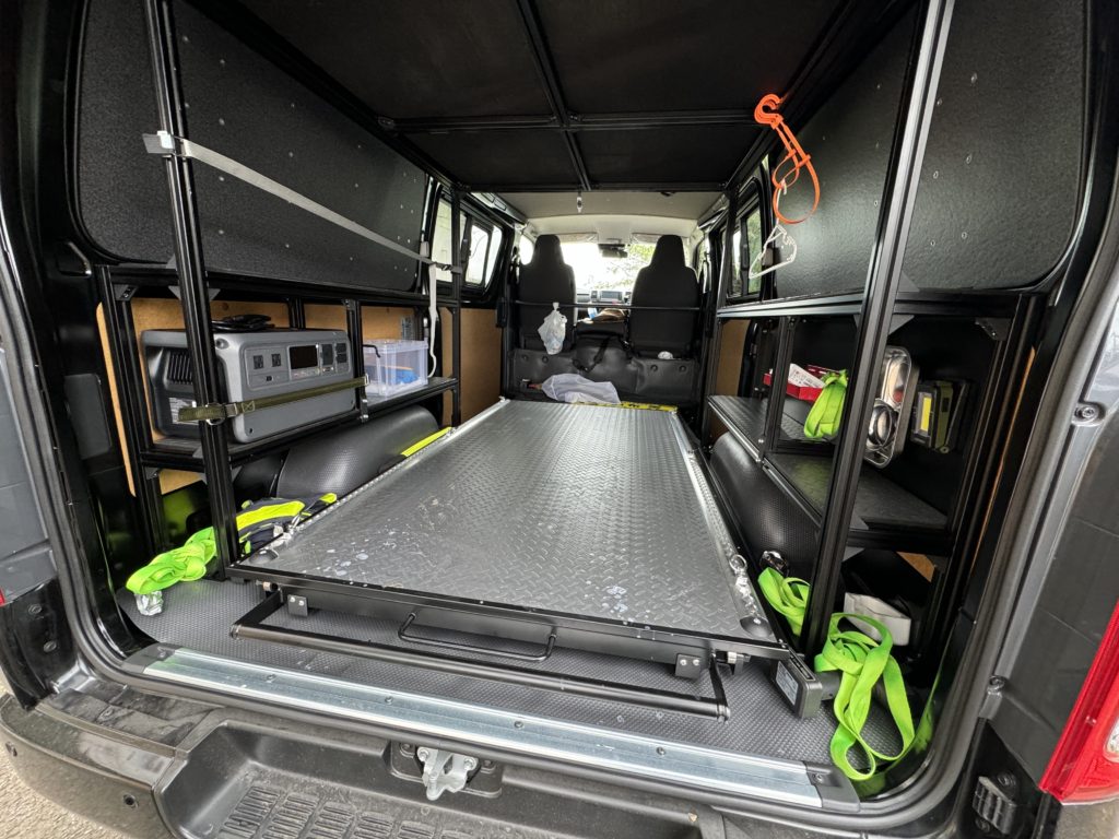ドローンポーターに搭載されたスライドフロア。向かって左側には DJI Power 1000 も積載されている。
