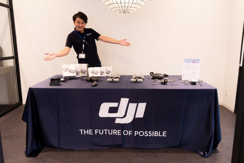 それでは当日の様子を紹介いたします。今回のイベントは大きく分けて3部制です。1.DJI製品展示、2.スライドを用いた製品紹介、3.体験フライトを行いました。