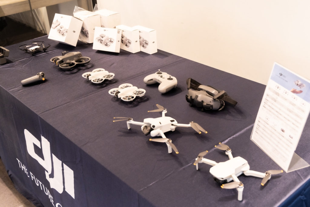 展示スペースにはNeo とそれに対応した送信機やゴーグル、当日お持ち帰り可能な在庫が並びました。みなさんお馴染みの Tello や Mini 4 Pro 、そして手前側には Mini 2 SE もありますね。