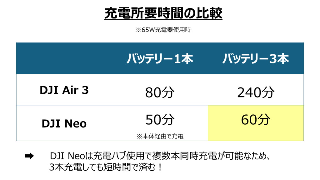 なんと、今回は3本同時に充電ができるんです! Air3 と Neo のバッテリーハブで3本充電するのにかかる時間をご覧ください。