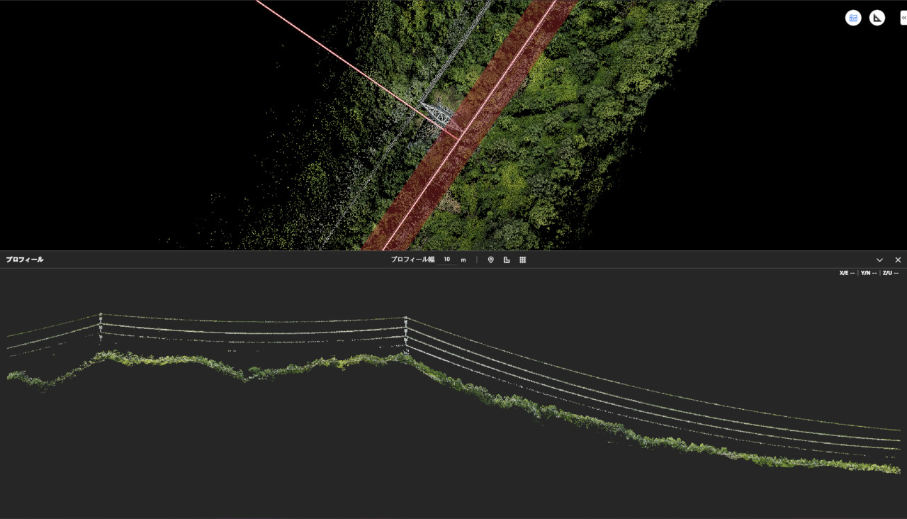 ドローンは送電線との間隔を常に維持しながら安全に飛行します。これにより、送電線への衝突リスクを回避して安定した計測作業が可能になります。送電線は完全な水平ではなく部分的に垂れ下がっています。そのような部分ではドローンの高度を下げ、送電線との間隔を維持したまま飛行します。送電線の垂れ下がった幅を把握して、事前に送電線との間隔を維持したフライトルートを作成することは、従来はほぼ不可能でした。