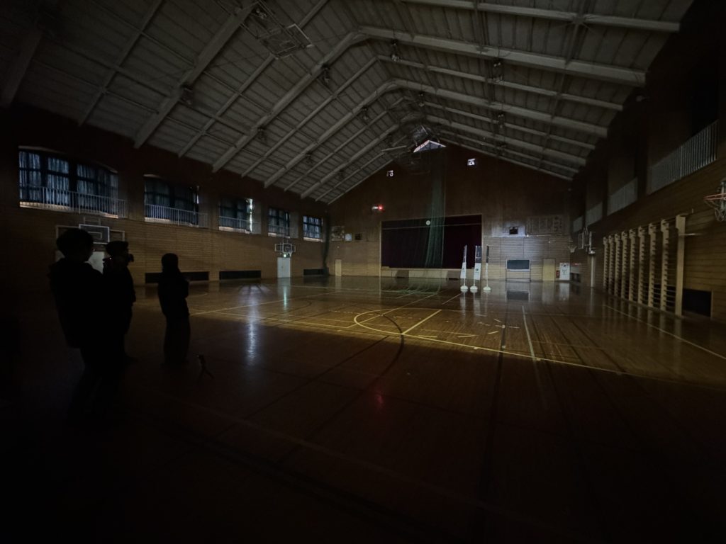 また夜間飛行での障害物検知機能を確かめるため、照明を落とした体育館での検証をしてもらいました。