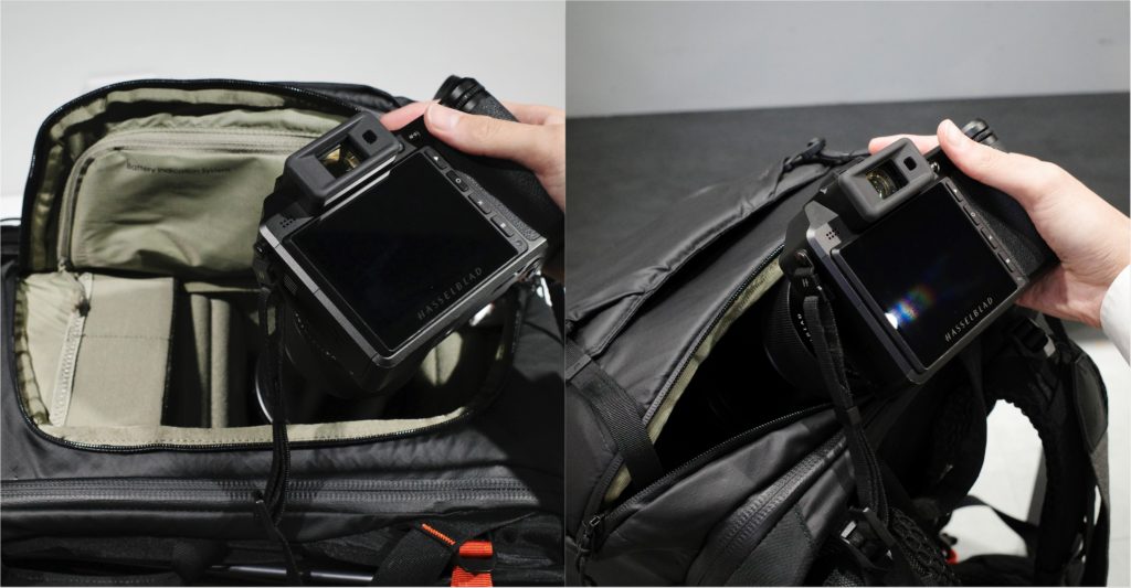 2つのシステムを満足に入れながらも、まだメインコンパートメント以外は何も入れてません。さらにフィルターやバッテリーなどのアクセサリーも余裕で、外側には三脚やライティングスタンドなどを2本までセットできます。大きな機材がここまで入るなら、皆さんが想定する機材の量は大体収納できると思います。