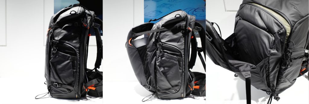 メインコンパートメントへのアクセスは、サイドアクセスが1箇所、背面側はマグネット式ダブルロックシステムを備え底面を軸に180°フルオープンする仕様です。さらに上部にも大きく開く取り出し口があり、望遠レンズを装着したカメラでも上から素早く取り出すことができます。これだけ見ると大人気カメラバッグの OneMo 2 BackPack 35L と特徴が似ていますが、やはりそこは OneProシリーズ。あらゆる部分が「Pro」仕様に進化した造りになっています。