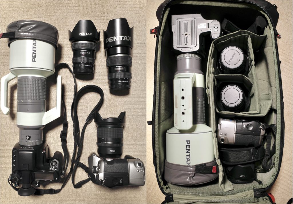 まずは私物の機材(全てメーカーはPENTAX)を、シチュエーションも考えながら収納していきます。撮影の軸はフルサイズ、でも中判デジタルでも撮りたい。サブ機としてAPS-C機と、念のためストロボも入れておくか等々、考えられるだけ入れていきます。欲張りです。でも、持っていかなければ現地では使えない。この事実は覆すことはできないのです。そうしてできあがったシステムがこちら。