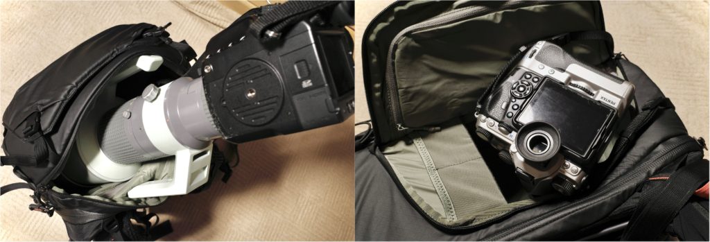 ちなみに、超望遠レンズと言えば「レンズを付けたままカメラを上から取り出せるか?」を重視されている方も多いですが、OnePro Focux ならご覧の通り。前玉だけでなく持ち手も2つ付いた大きなレンズでも、全く問題なく取り出せます。サイドアクセスについても、縦グリップ付きフルサイズ一眼レフが取り出し可能で、サイドアクセスといってもおまけのサブ機能ではないのです。