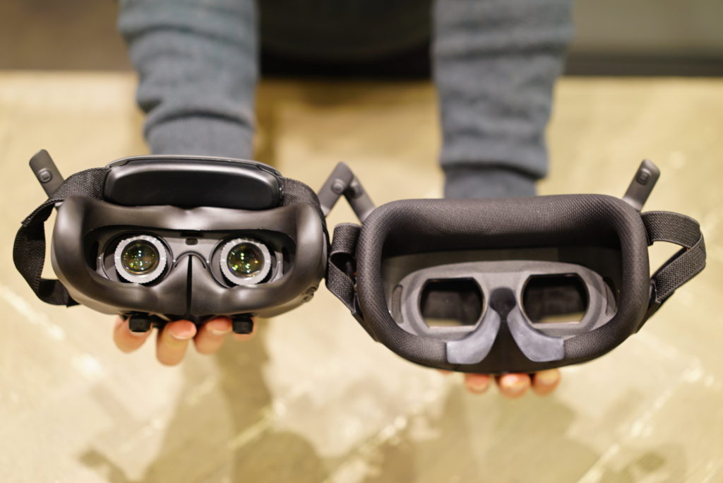 今回登場した Goggles N3 と Goggles 3 とのもっとも大きな違いは、ゴーグル内部のディスプレイが単眼になったことと、視度調整がなくなり普段眼鏡を掛けている方がそのままゴーグルを装着できることです。画像からも分かるように、眼鏡を掛けたまま装着するのでゴーグル自体が大きくなりましたね。