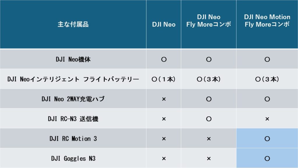 すでに発売しているNeo単体や Neo Fly Moreコンボ と比較しやすいよう表を作成しましたのでご覧ください。