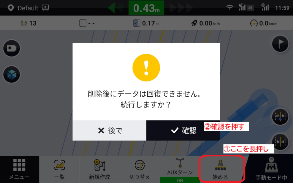 操作は簡単、面積計量の[始める]ボタンを長押し → 確認画面が出るので[確認]を押すだけです。
