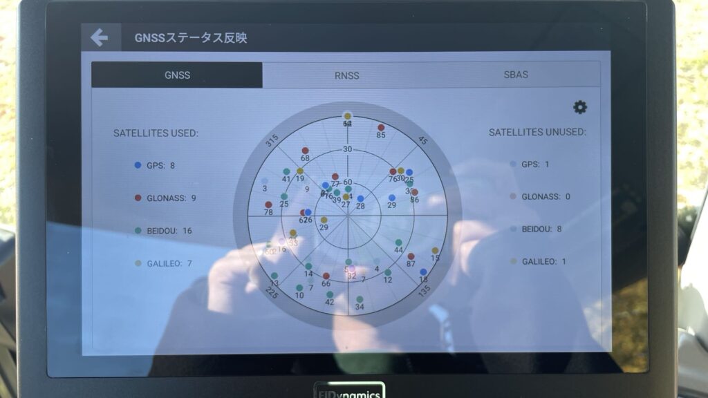 [メニュー]→[診断センター]→[GNSS]と進むと、リアルタイムの衛星状況が見えるようになりました。さらに、GPS、GLONASS、BEIDU、GALILEOといった国別の衛星のうち、どれかを使用しないという設定に対応、下の画像右上の歯車マークから設定できます。