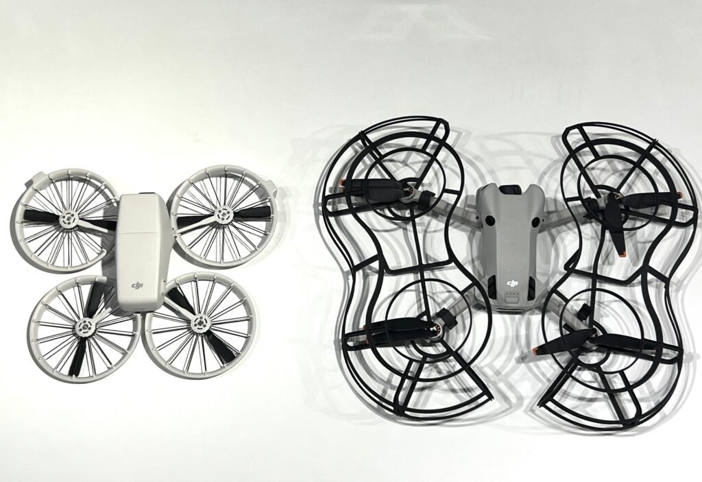 今回機体の重さは249g未満で、DJI Mini 4 Pro と同じです。サイズ感をプロペラガードを付けた状態で比べてみると、左の DJI Flip がかなり小さいことがわかります。