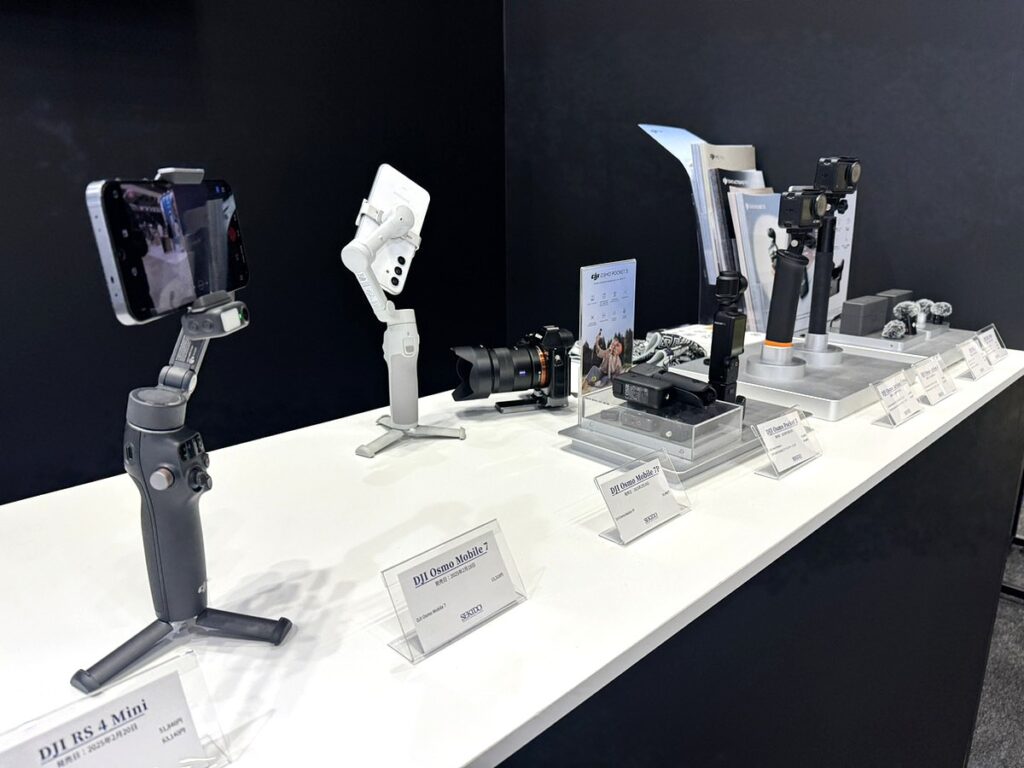 DJIブースでは、カメラ関連製品として2月に発売した新商品のミラーレス対応ジンバルスタビライザー DJI RS 4 Mini や、スマホ用ジンバル DJI Osmo Mobile 7/7P のタッチ&トライを実施しました。