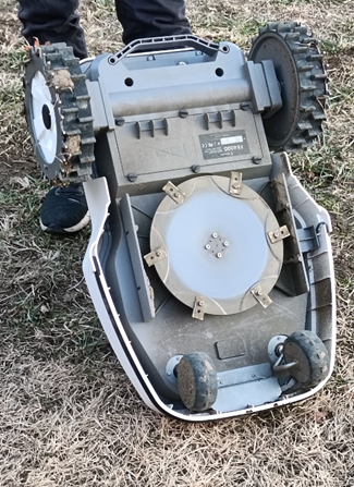 FJDロゴプレートの正体は……芝刈りロボットの充電ステーションの屋根でした。帰還時には屋根の内側のマークをカメラで読み取り、うまい具合に駐車してくれるようです。