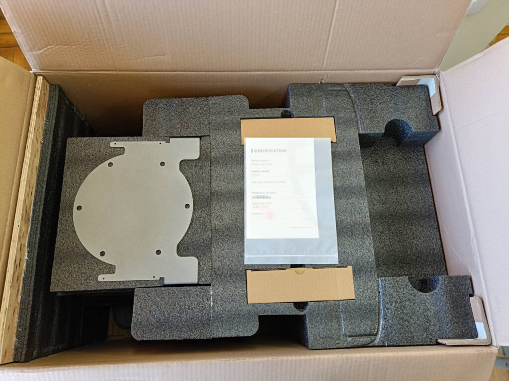 天板の下には本体の下部に取り付ける保護パーツと小さめの箱が2つ、そして保証書。大事な書類ですのでなくさないでくださいね。