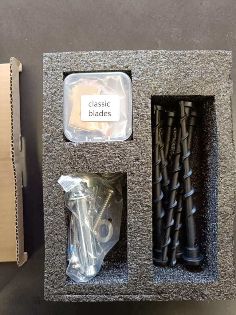 中身は電源コードと……芝の高さや密度に応じて交換するパーツです。こちらのパーツについては後ほど詳しくご案内します。
