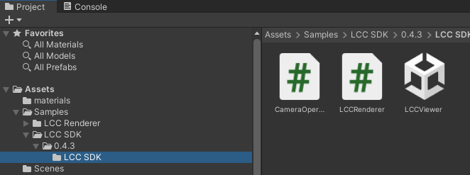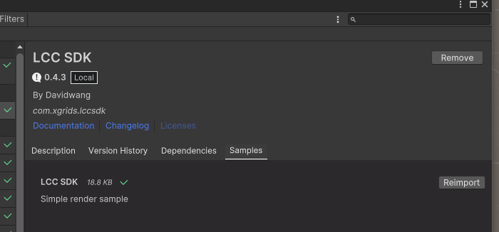 4)Unityで、LCC SDK プラグインのインポートが開始します。インポートが完了したら、プラグインのインポートパネルで[Samples]を選択して、サンプルをインポートしてください。