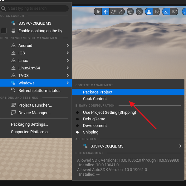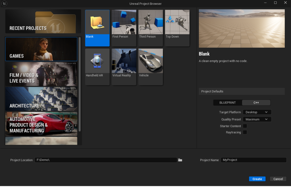 上記の例では、C++ プロジェクトを選択しています。プログラムを再度リリースしてパッケージ化する必要がない場合は、blueprintプロジェクトでも可能です。