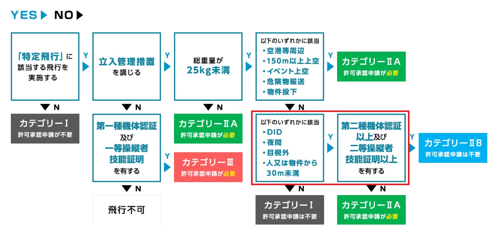 「機体認証+技能証明」の必要性は、国交省が公開するフローチャートをご参考ください。