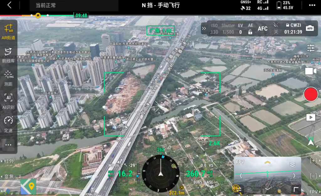 送信機の画面上で写っている映像に対して地図情報を重ね合わせます。具体的には地図の「道」「建物名」を表示することで、どこまでが敷地なのか、どこを第三者(車・人)が通るのかがわかるのでレベル3.5飛行において非常にうれしい機能となっています。